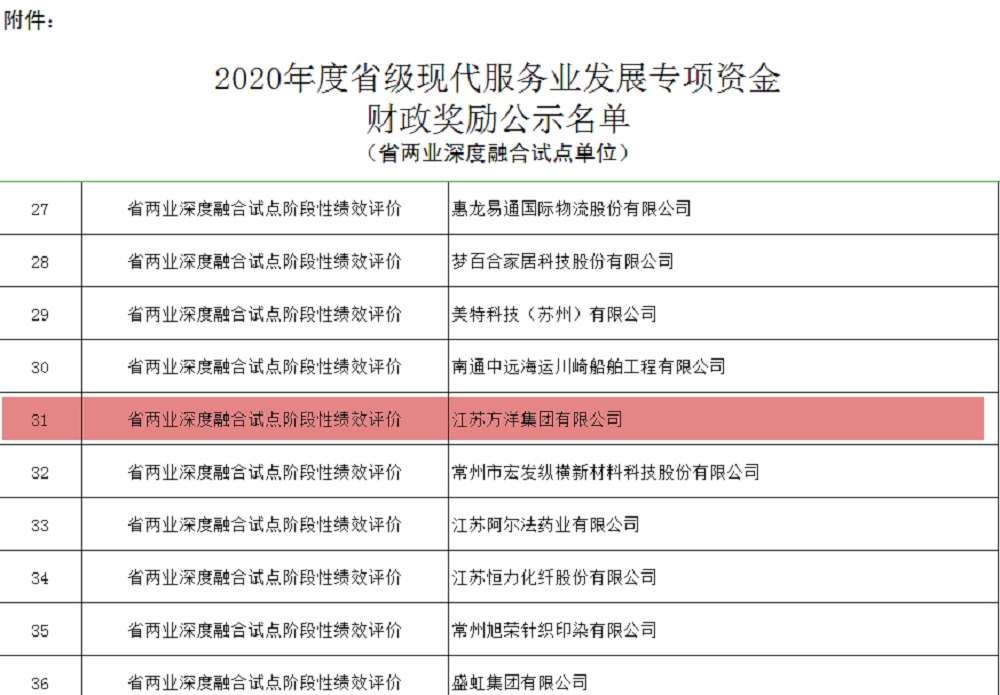 日前,省发展改革委公示了江苏省先进制造业和现代服务业深度融合试点单位财政奖励名单,经过企业报送材料、专家评审、现场观摩等环节,按照评价排名靠前、工作初见成效等综合评估,列入省龙头骨干企业试点单位的123家企业中通过本次阶段性绩效评估的仅有41家,万象城(中国)名列其中。