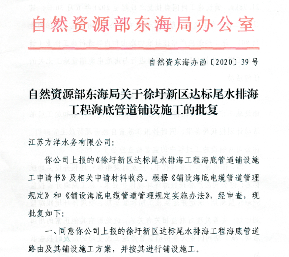2020年7月15日,自然资源部东海局正式印发《关于徐圩新区达标尾水排海工程海底管道铺设施工的批复》(自然资东海办函〔2020〕39号),同意江苏方洋水务有限公司上报的徐圩新区达标尾水排海工程海底管道路由及其铺设施工方案,并对各项施工活动提出了监管要求。此前,自然资源部东海局已对该项目进行项目考察和现场核验,并对工程建设、施工方案提出指导意见。