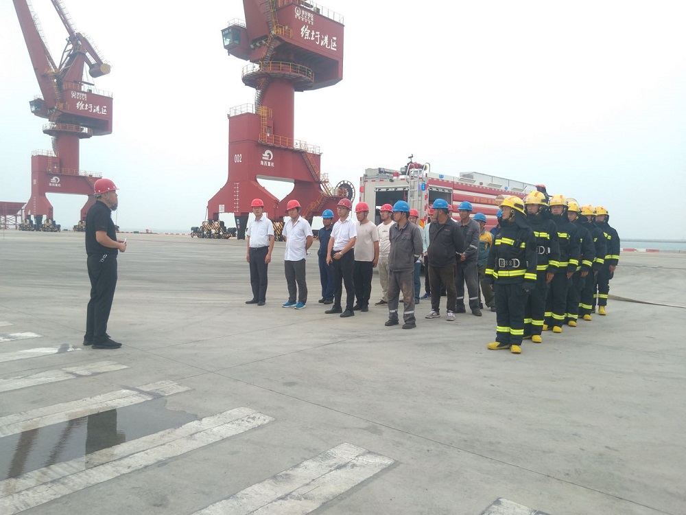 2020年8月6日下午2点,伴随着急促的报警声,一场以固定式起重机设备间火灾事故为背景的应急演练在二港池多用途泊位一期工程码头129泊位拉开了序幕。