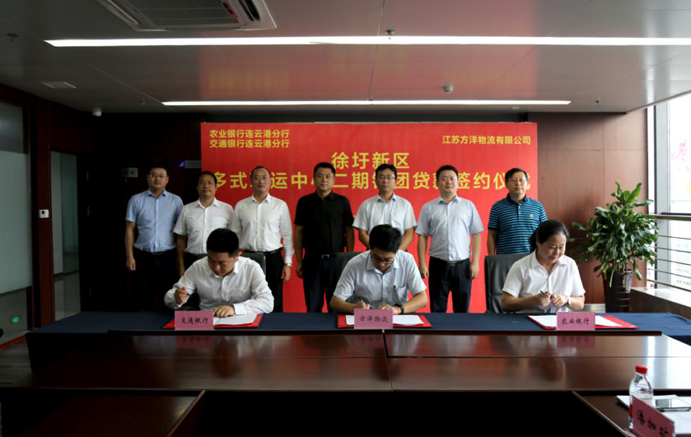 2020年8月27日,中国农业银行连云港分行、交通银行连云港分行为江苏方洋物流有限公司联合授信的徐圩新区多式联运中心二期项目银团贷款成功签约。农行连云港分行副行长吕茂春、交行连云港分行副行长何利明、万象城(中国)总裁安涛、副总裁于富忠参加签约活动。