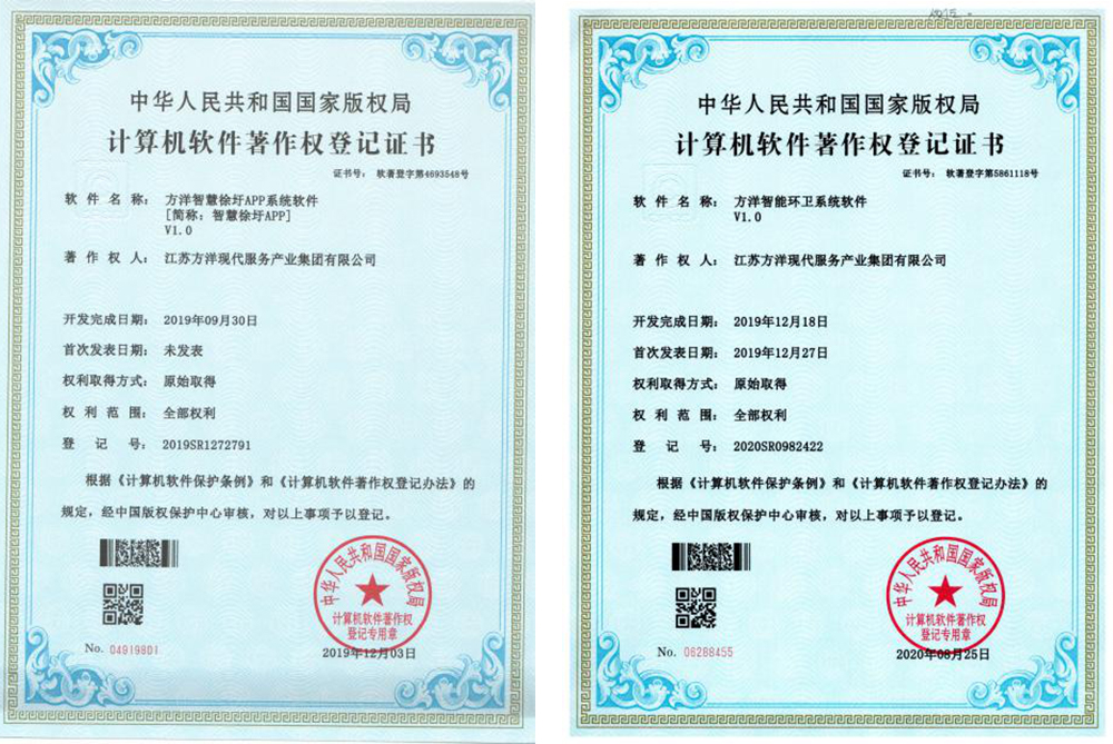 近日,由现代服务集团申报的方洋智能环卫系统软件顺利通过国家版权局知识产权认定登记和审核批准,这是继智慧徐圩APP后现代服务集团获得的第二个软件知识版权认定。
