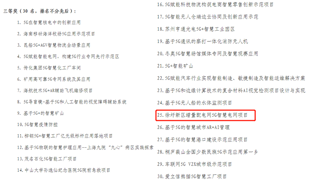 2020年9月20日,第三届“绽放杯”5G应用征集大赛在重庆精彩落幕,江苏东港能源投资有限公司“徐圩增量配电网5G智慧电网项目”荣获全国三等奖。