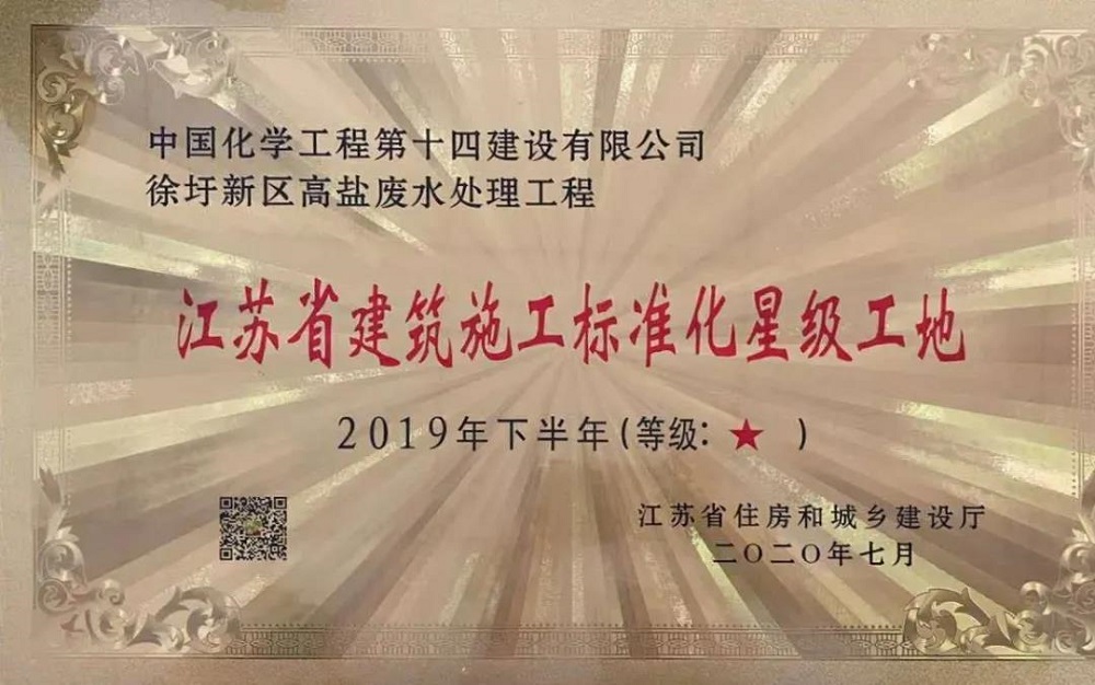 2019年下半年江苏省建筑施工标准化星级工地名单揭晓,江苏方洋水务有限公司的连云港石化基地工业废水第三方治理工程、徐圩新区高盐废水处理工程、徐圩新区第二水厂及配套管网一期工程榜上有名。这无疑是对项目各参与方的莫大鼓舞,是对项目的安全管理、文明施工、扬尘管控等各方面实施标准化管理的高度认可,也是对项目施工中严格落实各层级的各项环保要求的充分肯定,更为建筑施工标准化建设指明了方向。