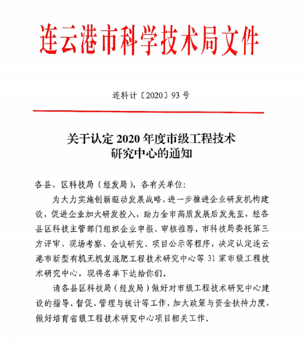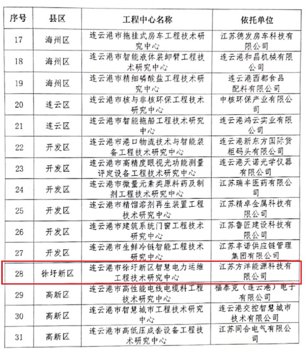 2020年10月26日,连云港市科学技术局发布《关于认定2020年度市级工程技术研究中心的通知》,由江苏方洋能源科技有限公司申报的“连云港市徐圩新区智慧电力运维工程技术研究中心”名列其中,成功获得专家组认定,这也是徐圩新区今年唯一一个获批项目。此次技术研究中心的获批,标志着方洋能源科技公司科研工作又迈上了一个新的台阶。