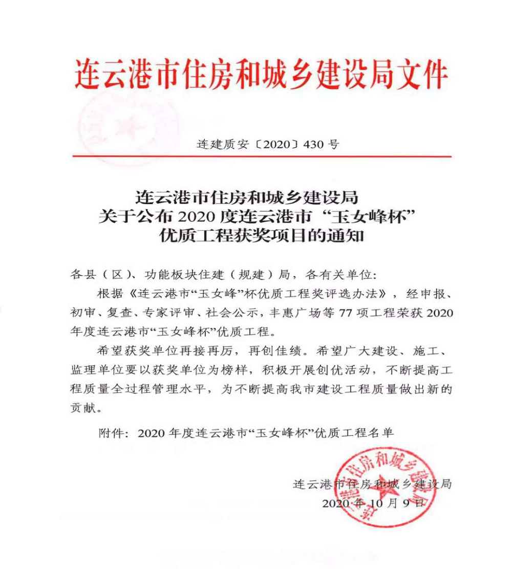 根据连云港市住房和城乡建设局《关于公布2020度连云港市“玉女峰杯”优质工程获奖项目的通知》,由江苏方洋建设工程管理有限公司代管的徐圩新区棚户区改造安置地块道路工程(一期)及连云港石化产业基地生产防护绿地苏海路二期绿化工程荣获2020年度连云港市“玉女峰杯”优质工程奖。