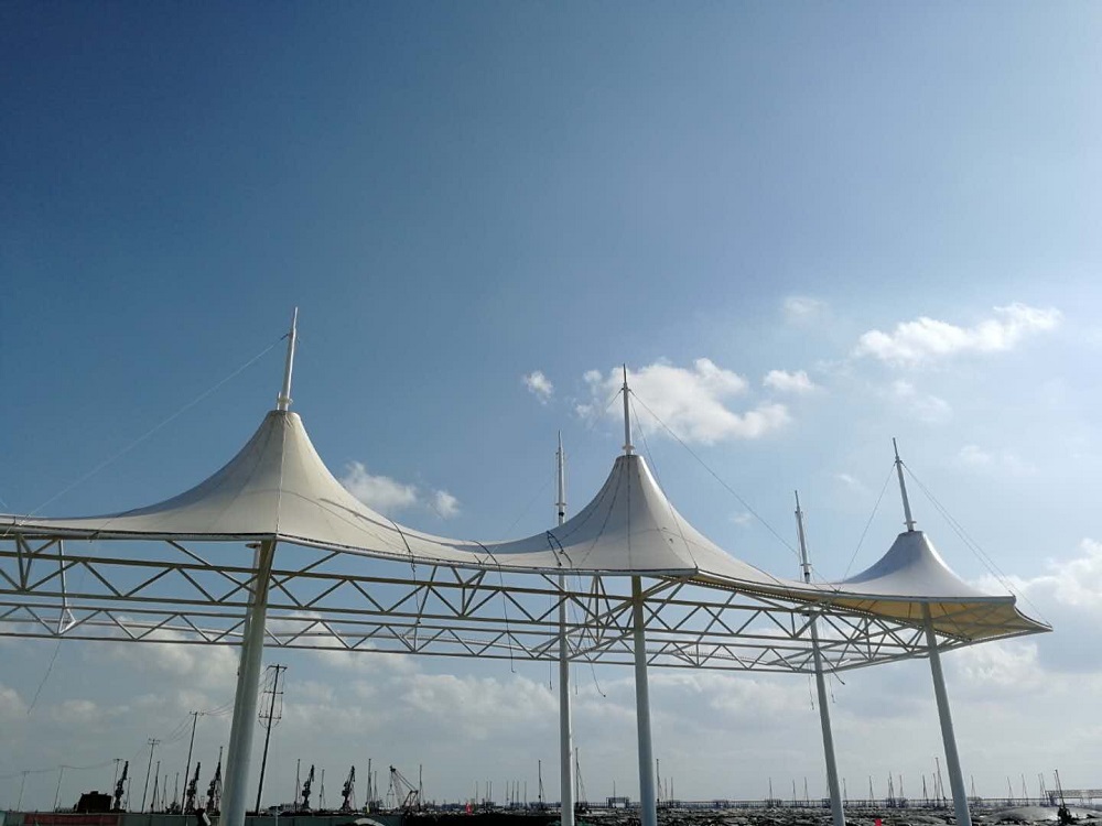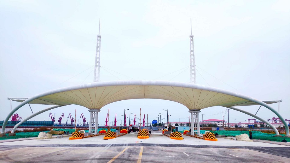 日前,在徐圩港区我们可以看到,两座张拉模式结构的大门矗立在方洋路、苏海路出入口,标志着大门主体工程已全部完工。