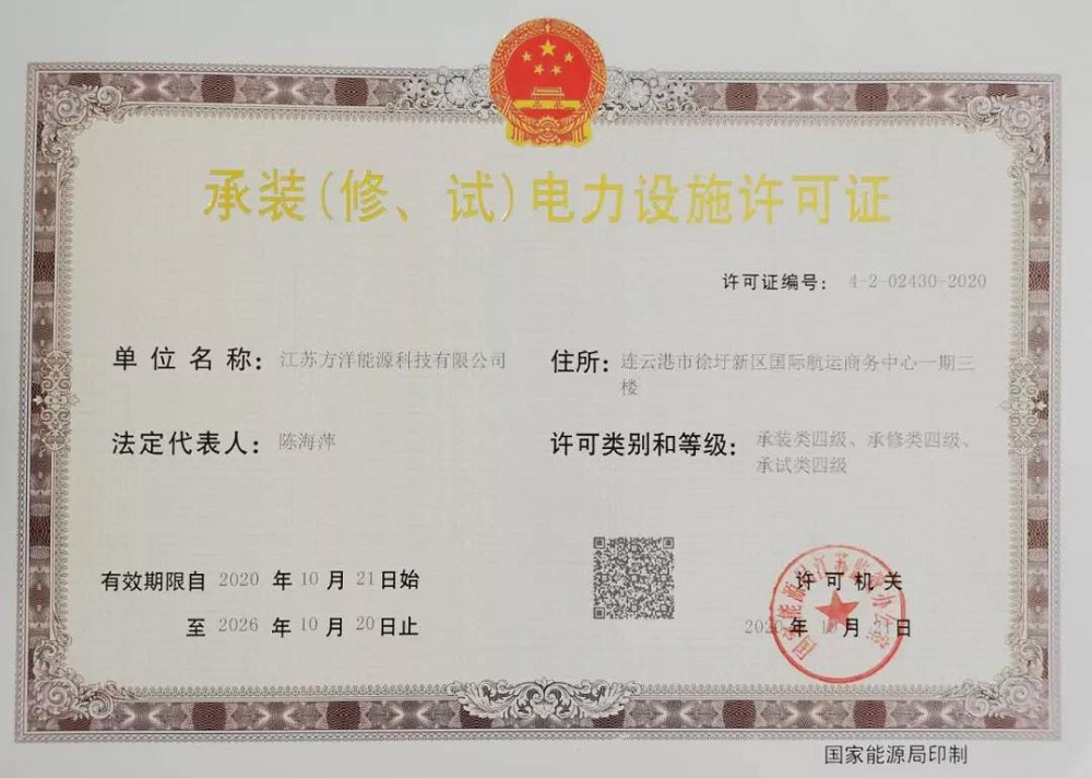 近日,江苏方洋能源科技有限公司承装(修、试)电力施工四级资质申请已由国家能源局江苏监管办公室审批通过。这意味着能源科技公司可在35千伏及以下输电、供电、受电等电力设施安装方面顺利展开施工作业,也标志着能源科技公司从能源供应商到“能源供应商+服务商”的角色转变。