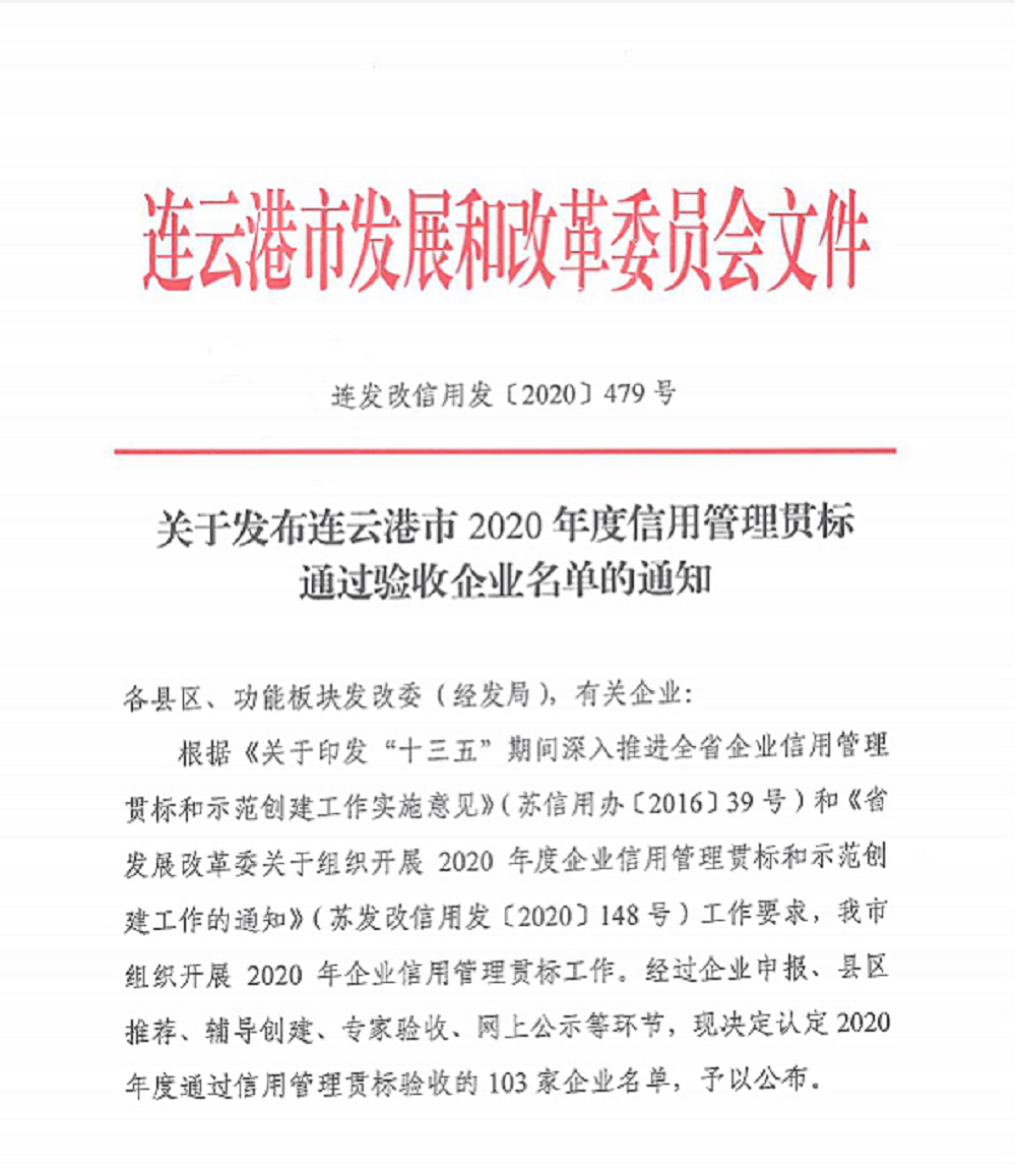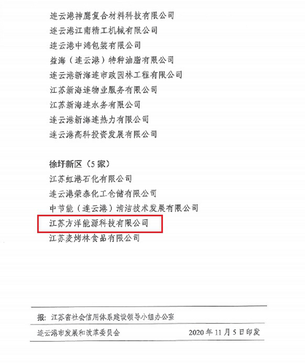 11月5日,连云港市发展和改革委员会印发《关于发布连云港市2020年度信用管理贯标通过验收企业名单的通知》,江苏方洋能源科技有限公司顺利通过企业申报、县区推荐、辅导创建、专家验收、网上公式等环节,成为连云港市2020年度企业信用管理贯标企业。