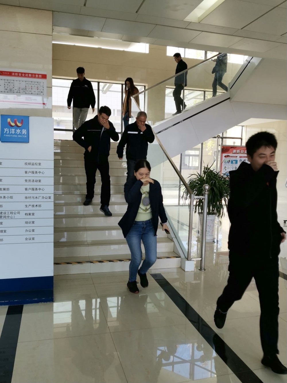 11月9日上午10点,水务公司办公楼火灾报警器突然响起,消防控制室传来“全体人员请注意,公司一楼仓库发生火灾,火势已蔓延,请全体人员立即疏散至公司办公楼前集合,疏散中请不要乘用电梯!”。随后公司全体人员迅速逃离办公楼,途中用手代替湿毛巾捂口鼻,弯腰前行,以最快的速度到达指定疏散集合点,整个过程用时3分12秒。