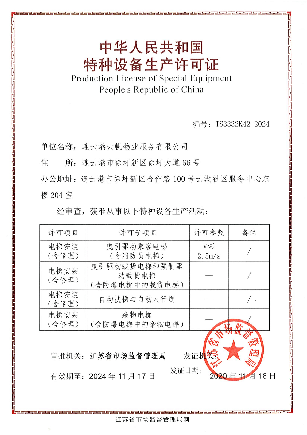 近日,云帆物业公司顺利取得江苏省市场监督管理局颁发的特种设备生产许可证(电梯安装含维修),标志着公司正式具备电梯安装、维修资质,物业工程运维服务实现功能扩展升级。