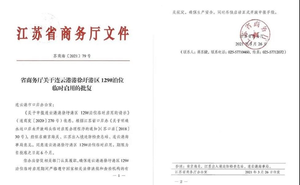 3月26日,徐圩港投公司129#泊位口岸临时开放获得省商务厅批准,这标志着该泊位将具备接靠外轮条件,为新区临港产业发展提供重要支持和保障。