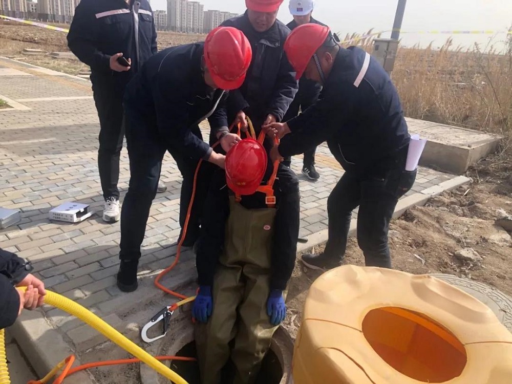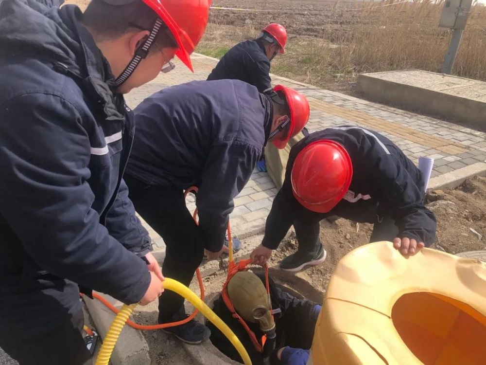 “有人昏迷,赶快救人!”,听到污水井清污作业现场传来求救声,现场作业人员立即放下手中的工作,打电话通知120,报告事故地点,在现场作业负责人徐舒阳的领导下展开救援。一名人员携带长管呼吸器进入事故井对受困人员施救,其余作业人员配合使用安全绳将受困人员拉出事故井,仅用1分钟将受困人员救出,进行心肺复苏,随后救护车进场,将恢复心跳和呼吸的伤者带去医院救治。