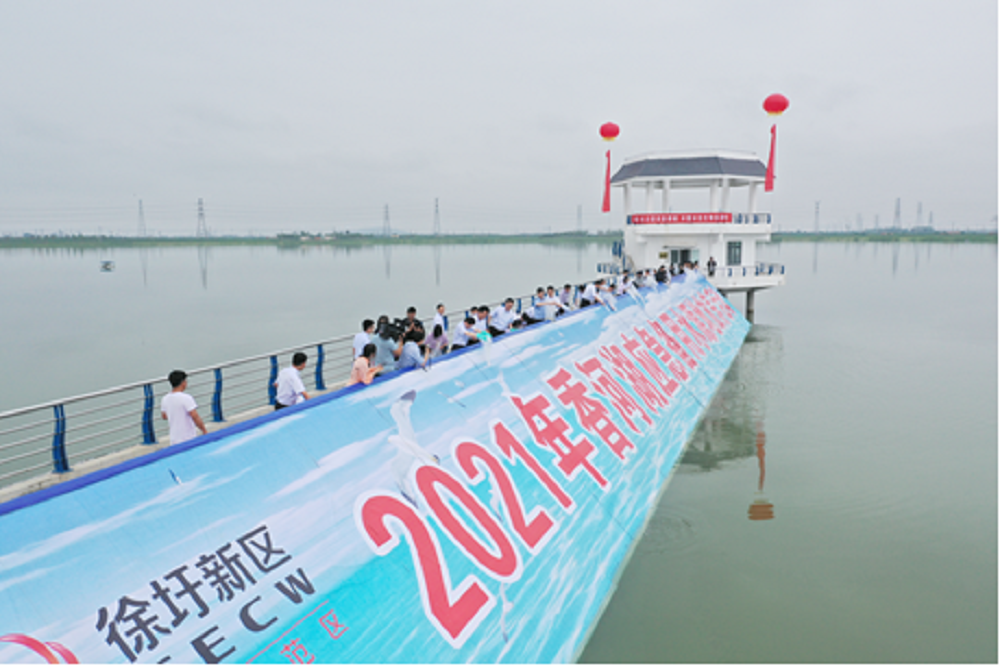 为进一步丰富香河湖应急备用水源地水生生物多样性,改善水生态环境,充分发挥水生动物的生态效益,6月17日上午,徐圩新区在香河湖举行了2021年生态放养活动,向水库放养了鳜鱼、鱤鱼、鲈鱼、黄颡鱼等10万余尾鱼苗,以实际行动促进生态增殖,保护水环境。