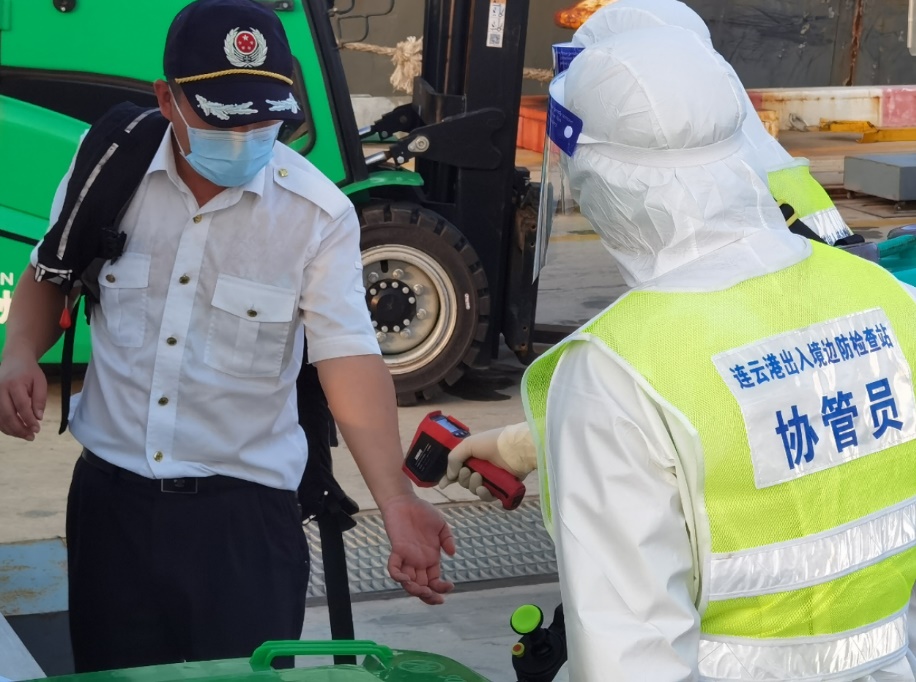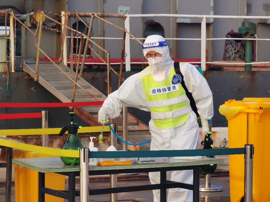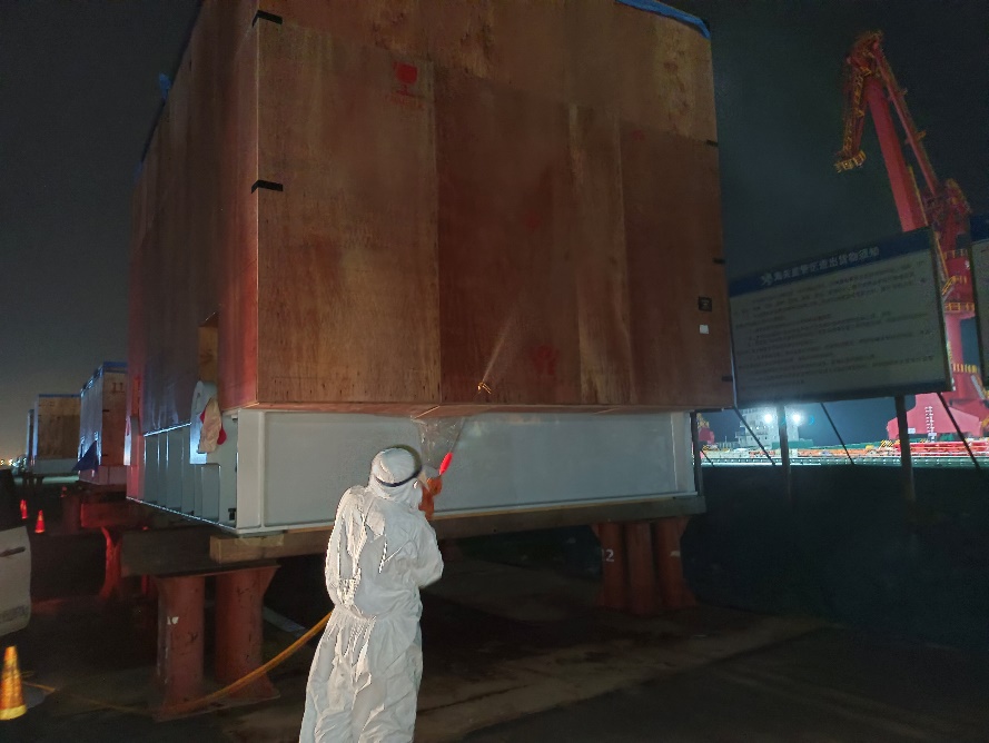 外贸船结束作业后,由CCIC相关检疫人员对落场设备进行取样和消毒。专班作业人员作业后进入专班休息区开始为期14天隔离,定期开展核酸检测,并跟踪人员隔离情况。医废物资放入存放区内,由相关资质单位及时回收处理。