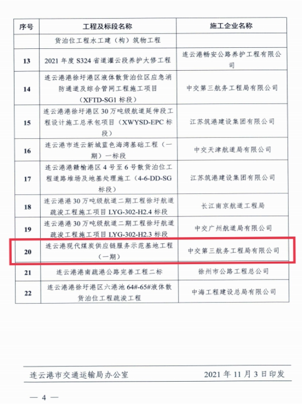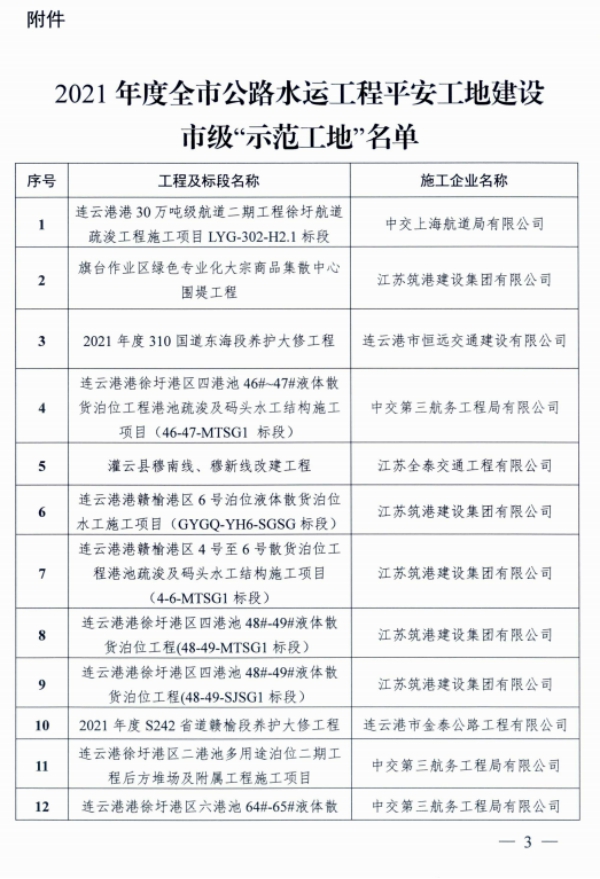 近日,2021年度全市公路水运工程平安工地建设市级“示范工地”名单公布,由江苏方洋物流有限公司建设的“连云港现代煤炭供应链服务示范基地工程”成功通过考核,荣获连云港市2021年度全市公路水运工程平安工地建设市级“示范工地”称号。