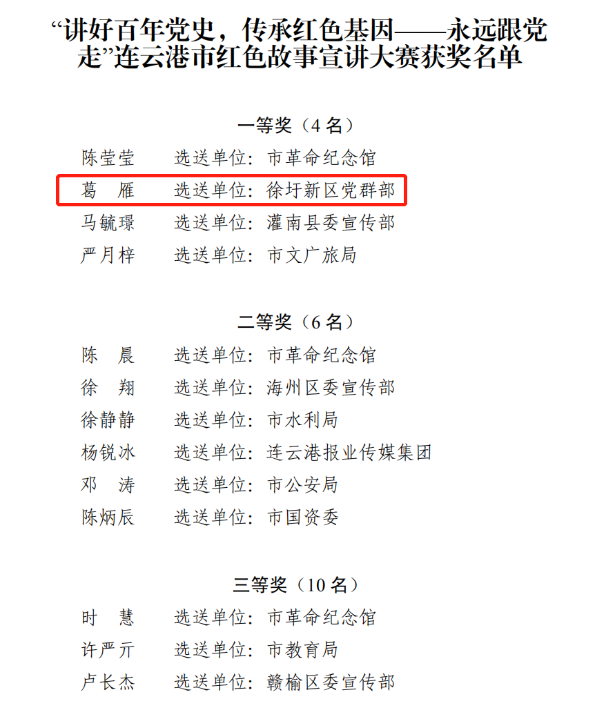 为庆祝中国共产党建党 100 周年,扎实开展“四史”宣传教育,由市委党史学习教育领导小组办公室、市委宣传部、市委党史工办、市文广旅局、报业传媒集团广电传媒集团联合举办的“讲好百年党史,传承红色基因——永远跟党走”连云港市红色故事宣讲大赛圆满落幕。经过预赛、初赛、决赛三个阶段,来自全市各部门各单位的200多名城乡基层一线选手参加比赛,通过讲述连云港地区一个个动人心弦 、感人肺腑的党史故事、红色故事、小康故事,热情歌颂对党和国家的热爱之情。最终,代表徐圩新区参赛的万象城官方网站选手葛雁脱颖而出,荣获本次比赛一等奖,徐圩新区党群部获得“优秀组织奖”称号。
