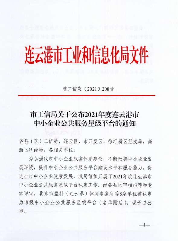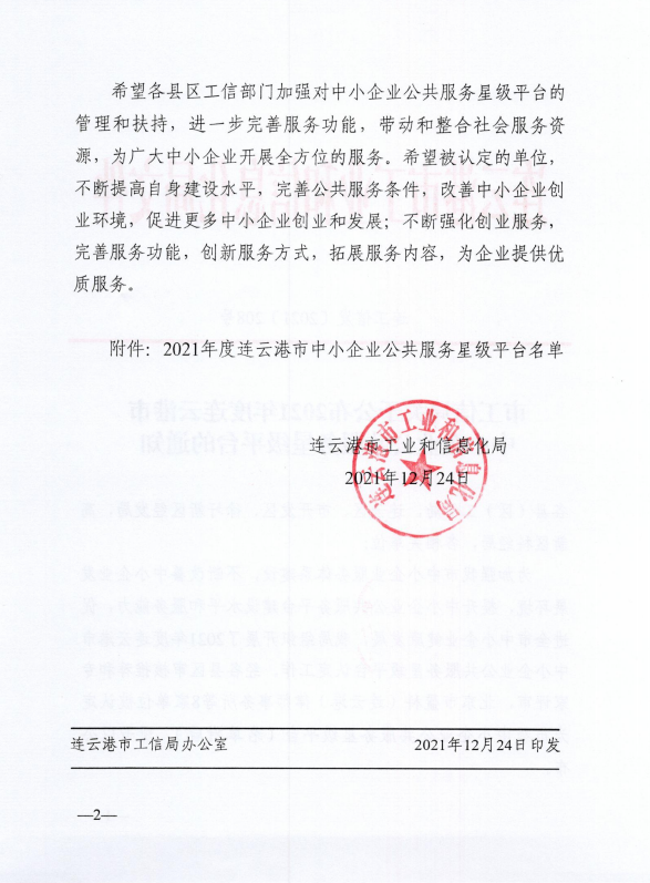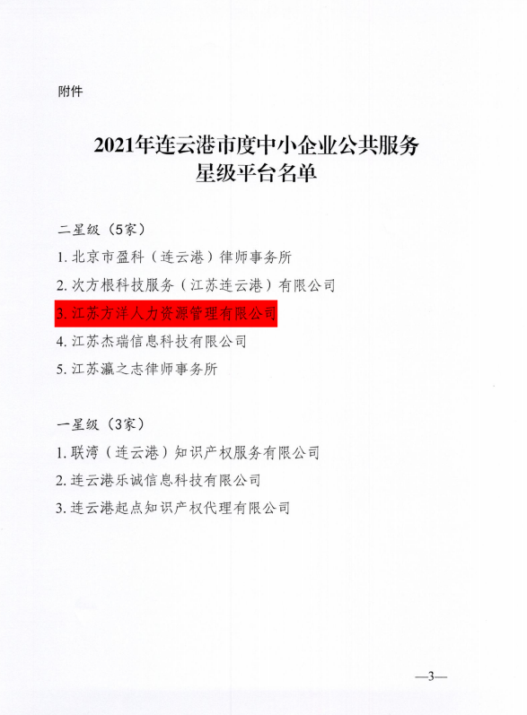 近日,市工信局公布了“2021年度连云港市中小企业公共服务星级平台认定名单”,江苏方洋人力资源管理有限公司凭借健全的管理制度、规范的服务流程和专业的服务能力,顺利通过“连云港市中小企业公共服务星级平台(二星级)”认定。