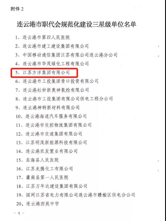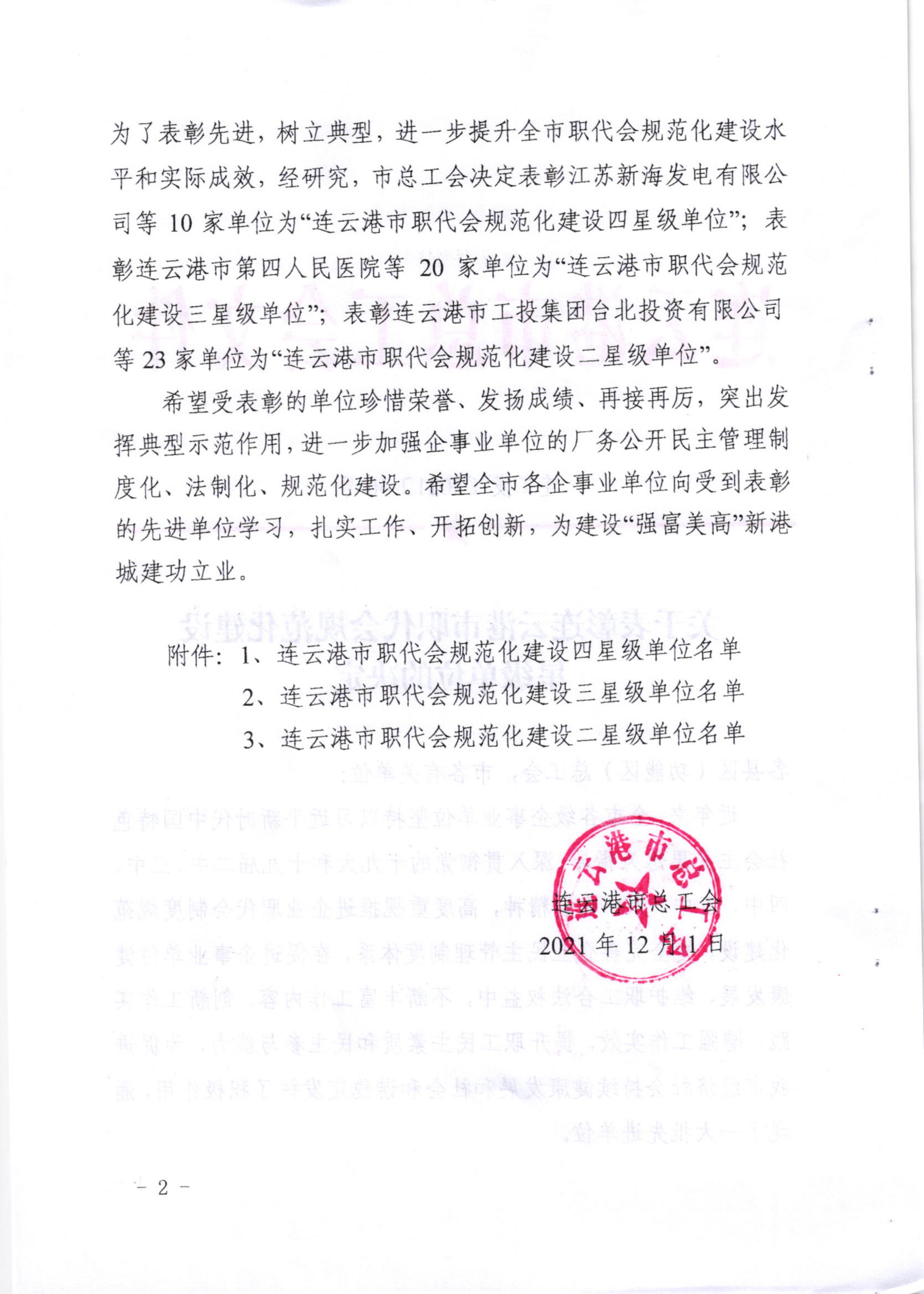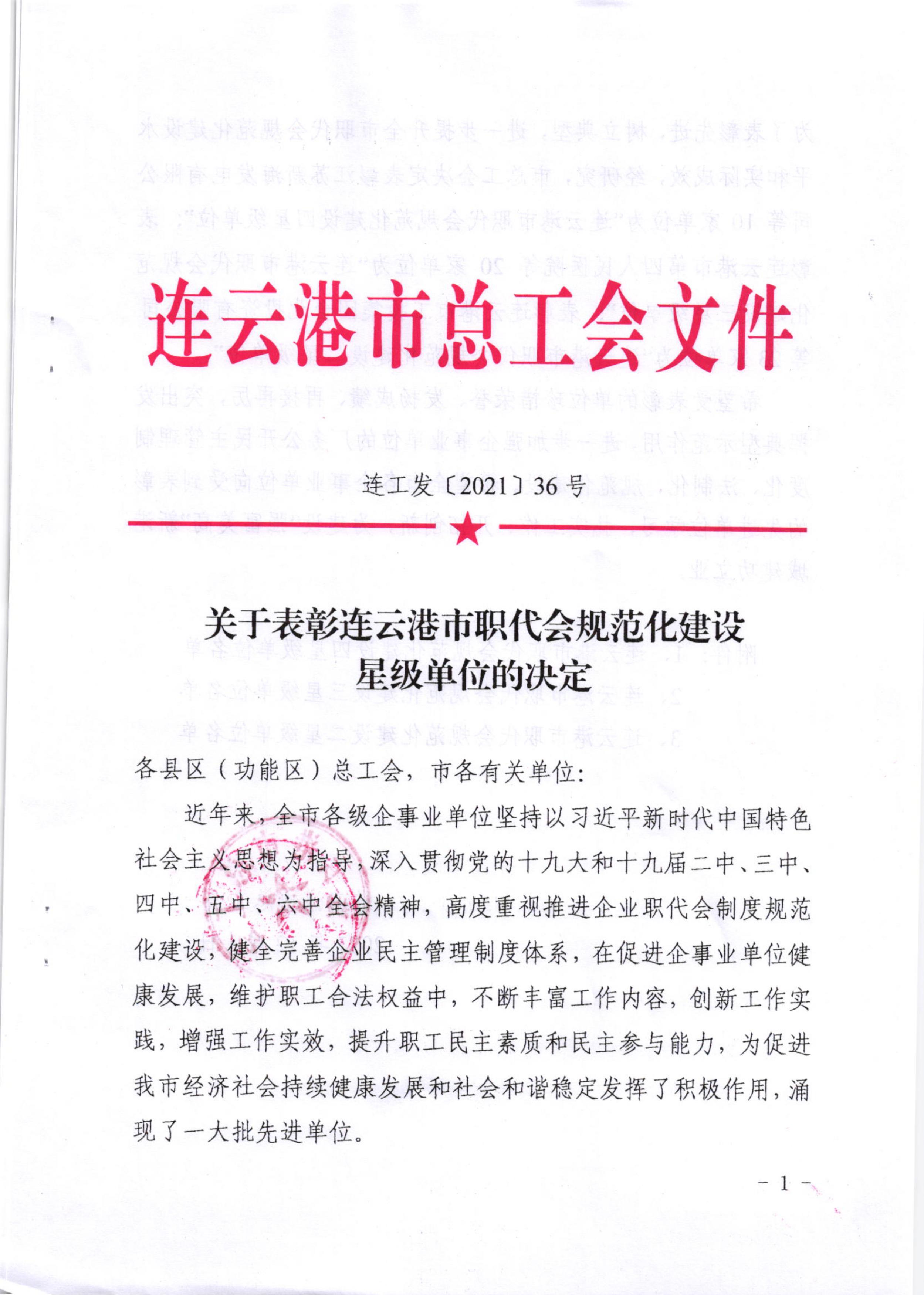 近日,由连云港市总工会组织开展的2021年连云港市职代会规范化建设星级单位评选揭晓。万象城官方网站被评为“2021年连云港市职代会规范化建设三星级单位”。据了解,本次“星级职代会”评选共评定了四星级企业10家、三星级企业20家、二星级30家。