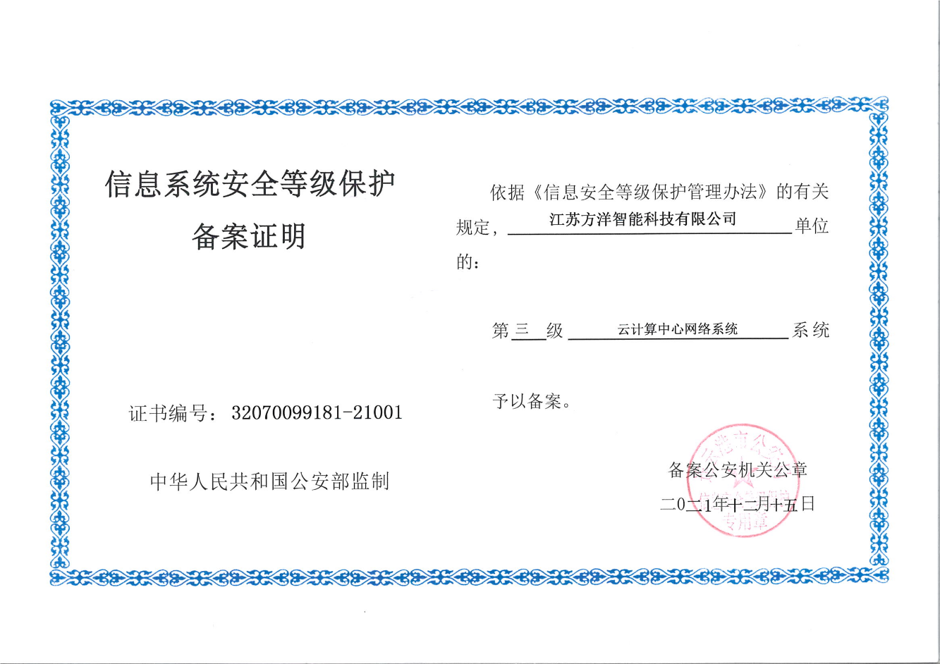 近日,方洋智能科技云计算中心网络系统顺利通过国家公安部信息安全等级测试备案,成功取得由公安机关核准颁发的“国家信息安全等级保护三级认证”。