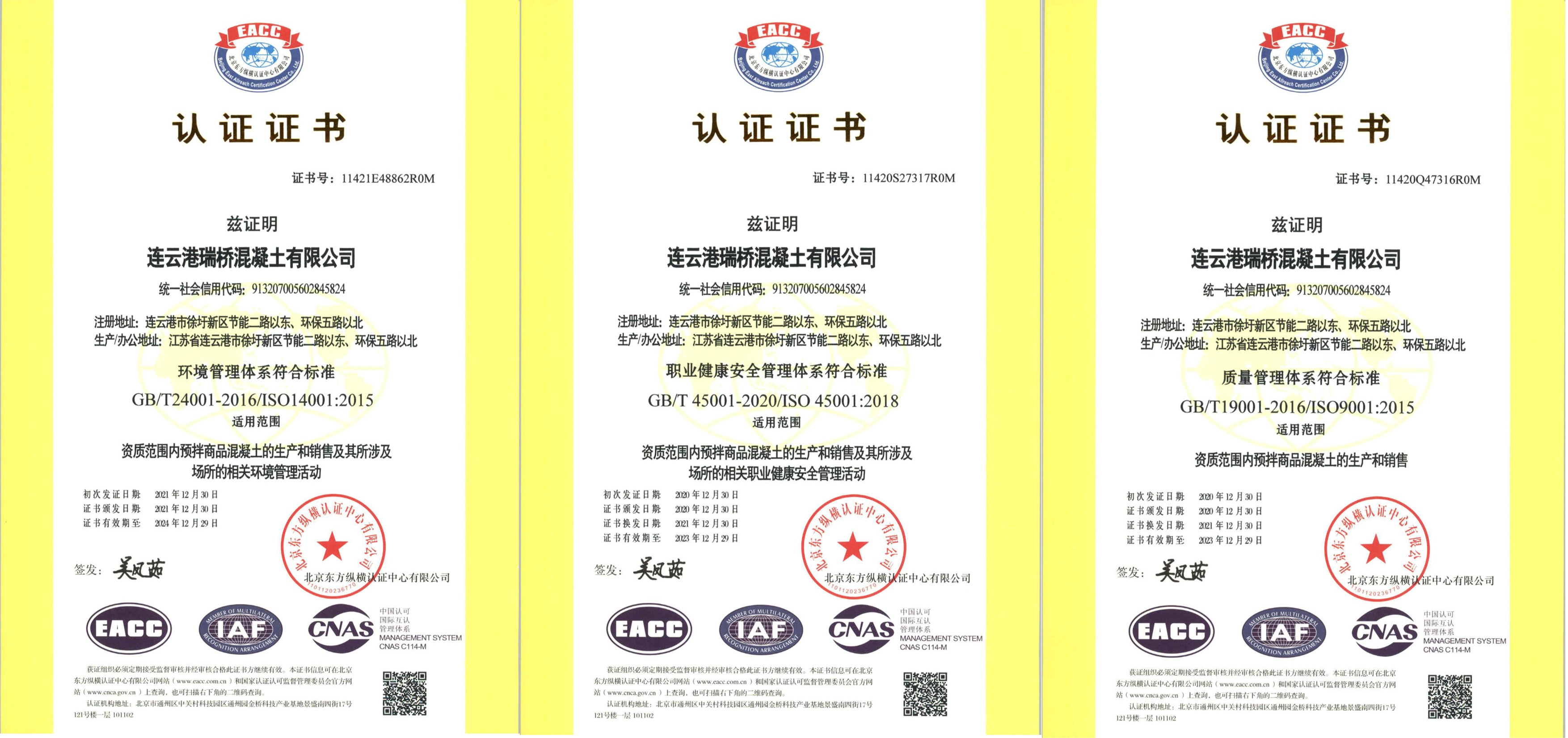 近日,瑞桥公司顺利通过ISO体系认证,获得ISO9001质量管理体系、ISO14001环境管理体系以及ISO45001职业健康安全管理体系认证证书,标志着公司质量、环境、职业健康等方面管理工作迈上新台阶,进一步增强公司规范化管理及风险管控能力。