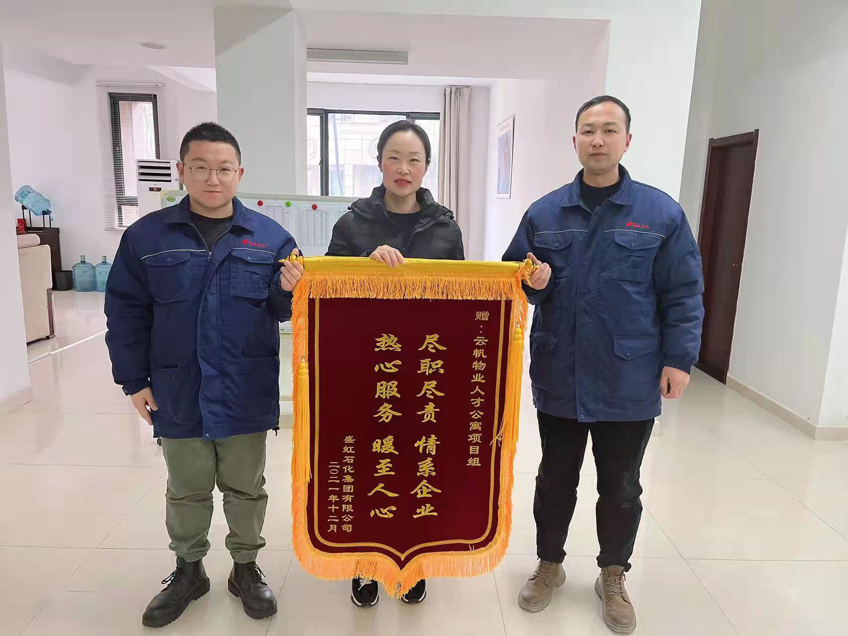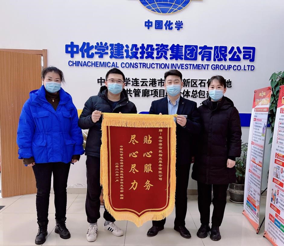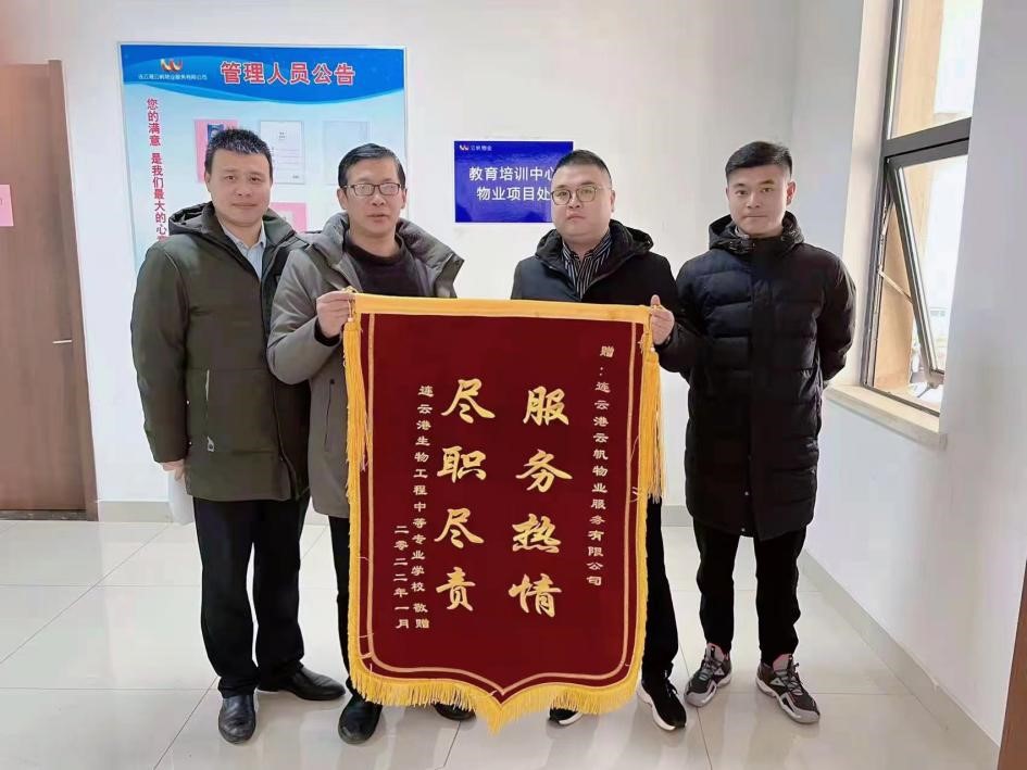 “金杯银杯不如老百姓的口碑,金奖银奖不如老百姓的夸奖”。近日,云帆物业公司陆续收到来自中国化学连云港石化基地联合体总包部、连云港生物工程中等专业学校、徐圩街道张圩社区居委会、江苏院连云港虹洋热电项目部等单位赠送的锦旗,感谢云帆物业公司一年来尽心尽力地热情服务。