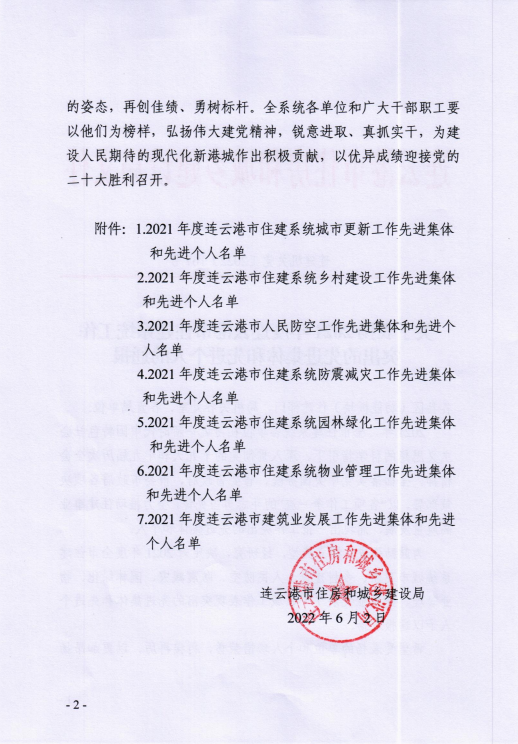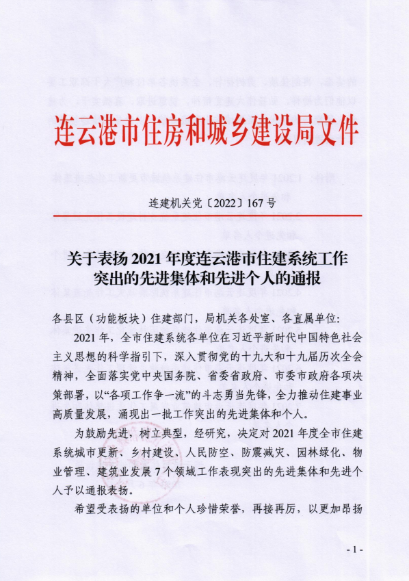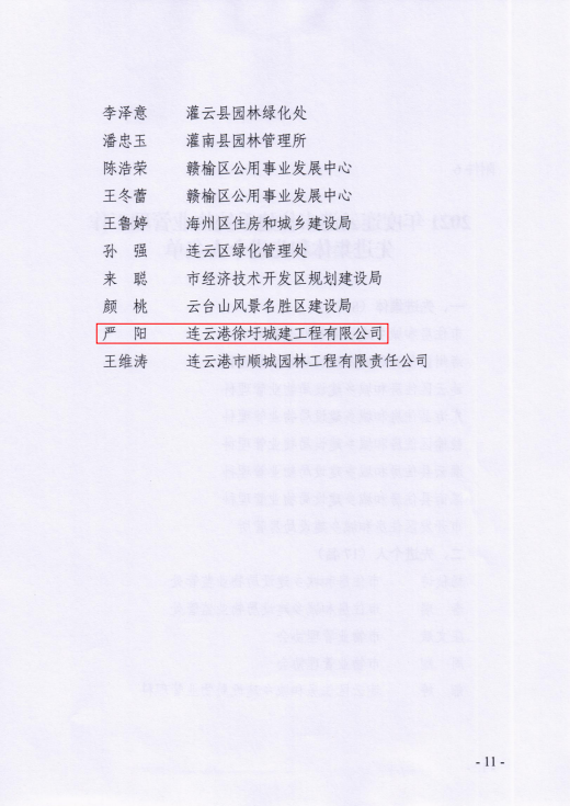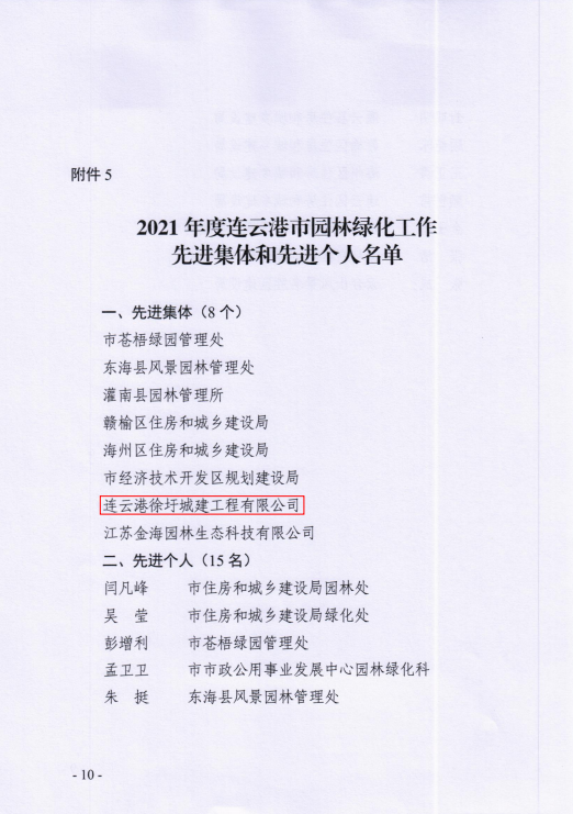 近日,根据连云港市住房和城乡建设局发布的《关于表扬 2021年度连云港市住建系统工作突出的先进集体和先进个人的通报》(连建机关党〔2022〕167号)文件获悉,徐圩城建工程公司在2021年全市园林绿化工作中成绩显著,获得2021年度“连云港市园林绿化行业先进集体”荣誉称号,公司严阳获得“园林绿化行业先进个人”荣誉称号。