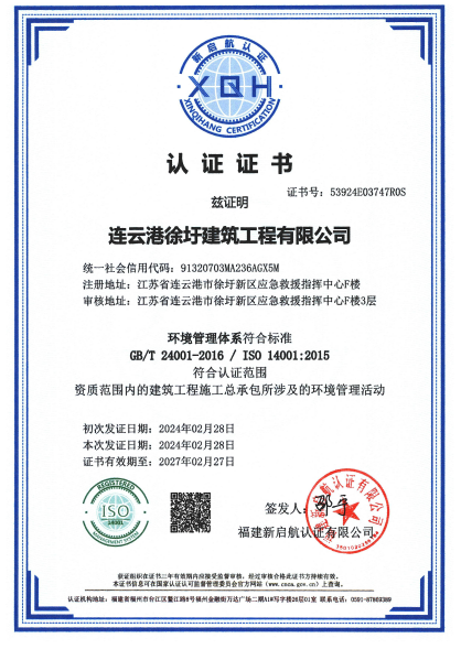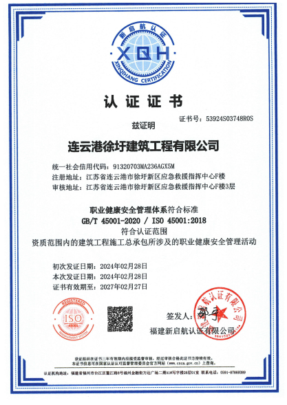 为提高综合管理水平,增强企业市场竞争力,徐圩城建公司下属子公司徐圩建筑公司于2023年启动ISO质量环境安全管理三体系认证建设和完善工作,并于2024年2月28日顺利通过质量管理体系标准(ISO9001)、环境管理体系标准(ISO14001)及职业健康与安全管理体系标准(ISO45001)三体系认证。